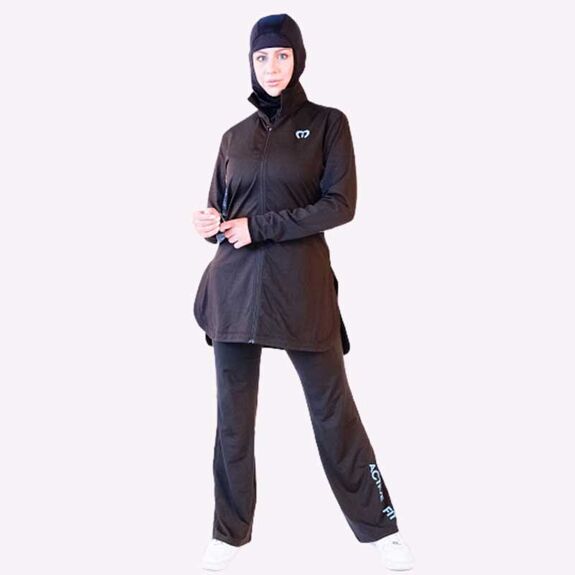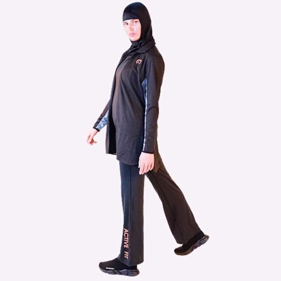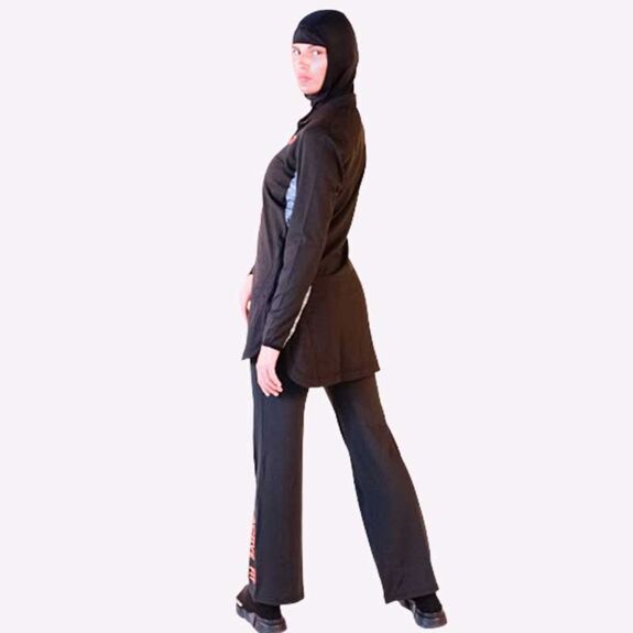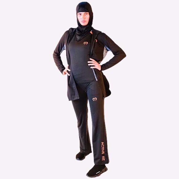 Description: Stay ahead of the game, innovate not imitate, our long line sports top designed with the latest sportswear technology gives you ultimate performace and total modesty. Modest fitting but compressed in all the right areas allowing a full range of movement. Contrast Orange panels to give you style, durability and performance. Full zip front jacket.