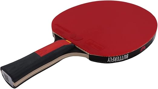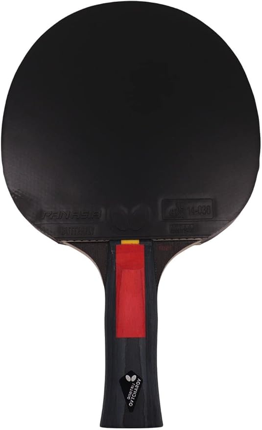 The Dimitrij Ovcharov Ruby Table Tennis bat from Butterfly is the world brand leader. The Dimitrij Ovtcharov Ruby features a strong 5-ply blade with an attractive, comfortable concave-shaped handle. This, combined with Butterfly ITTF-approved red and black Pan Asia rubber with a 2.0 mm sponge, provides a bat with good spin, speed, and control. The edge of the blade is protected by Butterfly side tape. The Ergo Grip finish is applied to the grip, meaning all the edges are smooth and rounded, so the bat feels more comfortable in the player's hand. This bat is particularly suitable for intermediate players. Bat specification: Blade: Strong 5 Ply blade Handle: Concave shape handle Rubber: Butterfly Pan Asia ITTF approved rubber with 2.0mm sponge Edge: Butterfly protective edging tape Speed: 90 Spin: 90 Control: 85 Player: Dimitrij Ovcharov European Champion